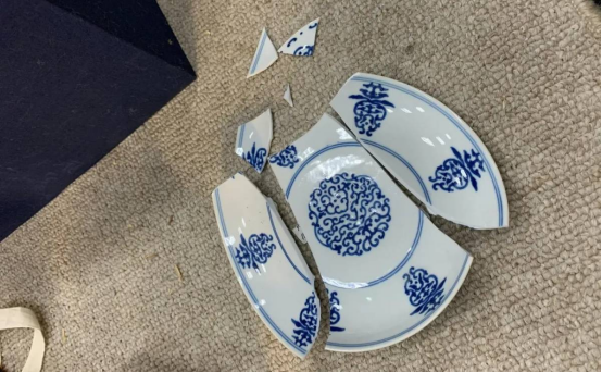 報道稱,其中一名科員誤以為盒內所有文物都已取出,把藍布盒倒置將底部脱落的白布黏好,再翻正該藍布盒時,因盒蓋沒有繫上帶,盒蓋掀開致箱內剩餘2件文物滑出,其中清乾隆青花花卉盤因員工反應不及而掉落地面,另外一件被接住則未掉落。