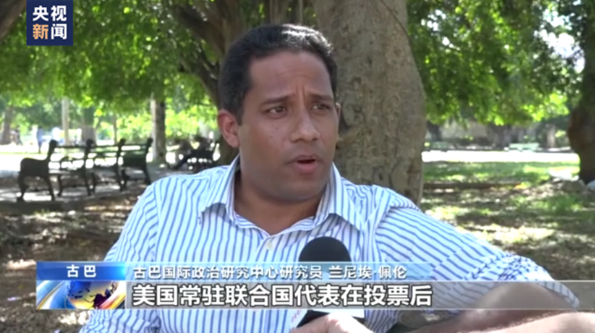 *古巴國際政治研究中心研究員 蘭尼埃·佩倫:*美國常駐聯合國代表在投票後,面對國際社會對古巴人民和革命政府的壓倒性支持時,為投票解釋説,封鎖政策是為了古巴人民,這是彌天大謊,一個謬論,我們必須堅決揭穿這個謊言。
