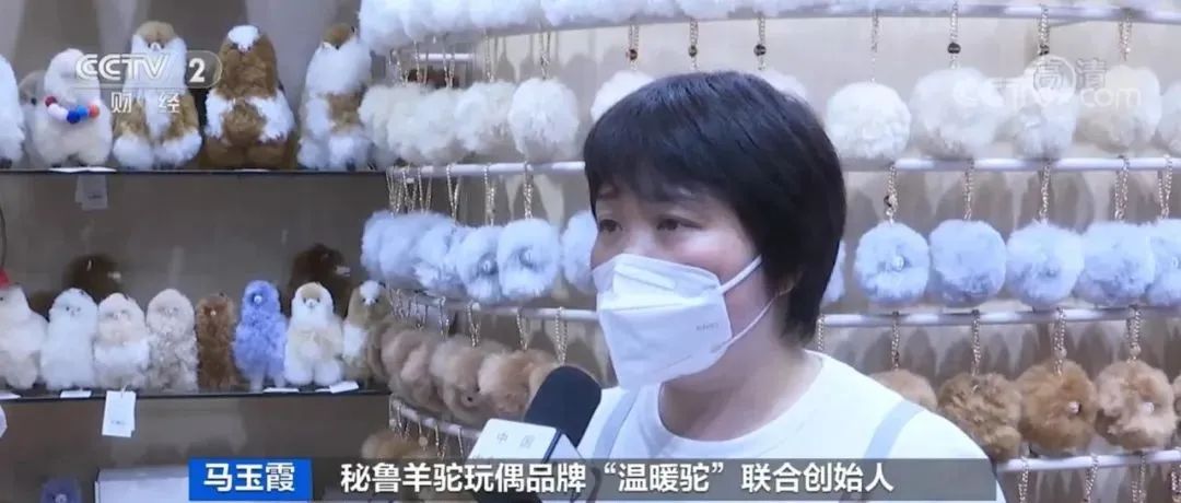 秘魯羊駝玩偶品牌“温暖駝”聯合創始人 馬玉霞*:* 設計師會抓住羊駝各種可愛的瞬間,來設計羊駝的產品,不僅手感很好,而且每一個玩偶的表情都特別呆萌。