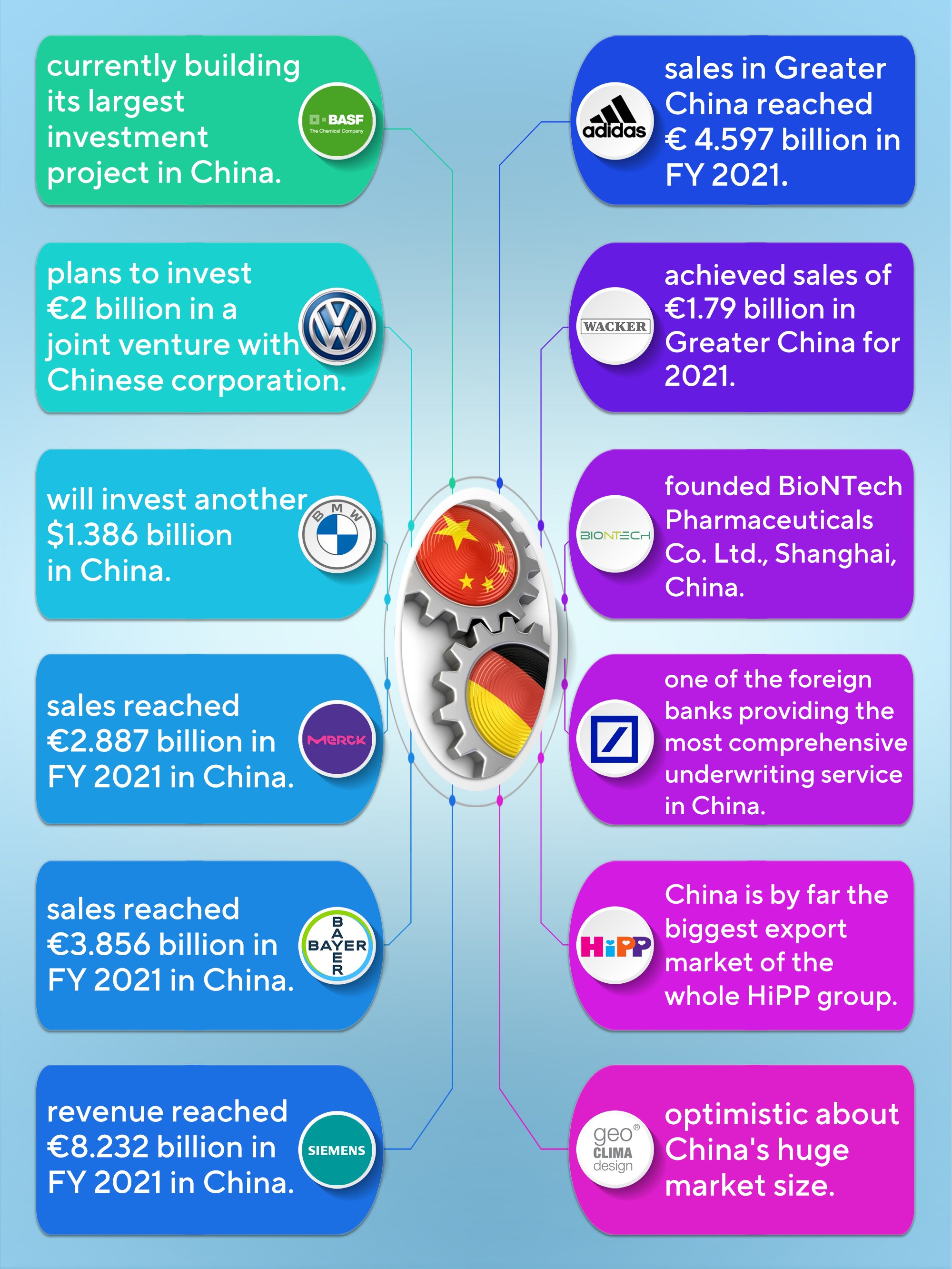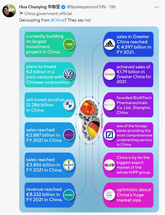 “與中國脱鈎?他們説不!” 中國外交部部長助理、發言人華春瑩5日晚發推,用一張圖片總結梳理了德國企業與中國合作的情況,並配發文字:與中國脱鈎?他們説不!