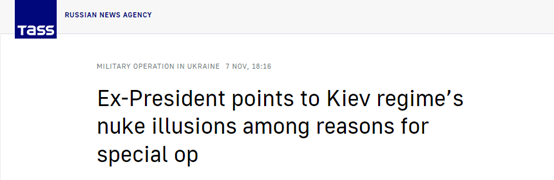 梅德韋傑夫繼續稱,烏方還説“會用這一武器來對付我們和他們自己的公民”,“當他們威脅要恢復核項目時,他們明確地暗示了這一點,這在很大程度上觸發了(俄方的)特別軍事行動”。