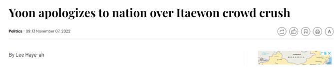 韓媒:尹錫悦首次正式就梨泰院踩踏事故向國民道歉