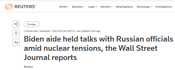 路透社介紹,近幾個月來,美國和俄羅斯之間的高層接觸很少公開,因為華盛頓方面堅稱任何關於結束俄烏衝突的會談都應該在莫斯科和基輔之間進行。報道還提到,沙利文於上週五(11月4日)訪問了基輔。