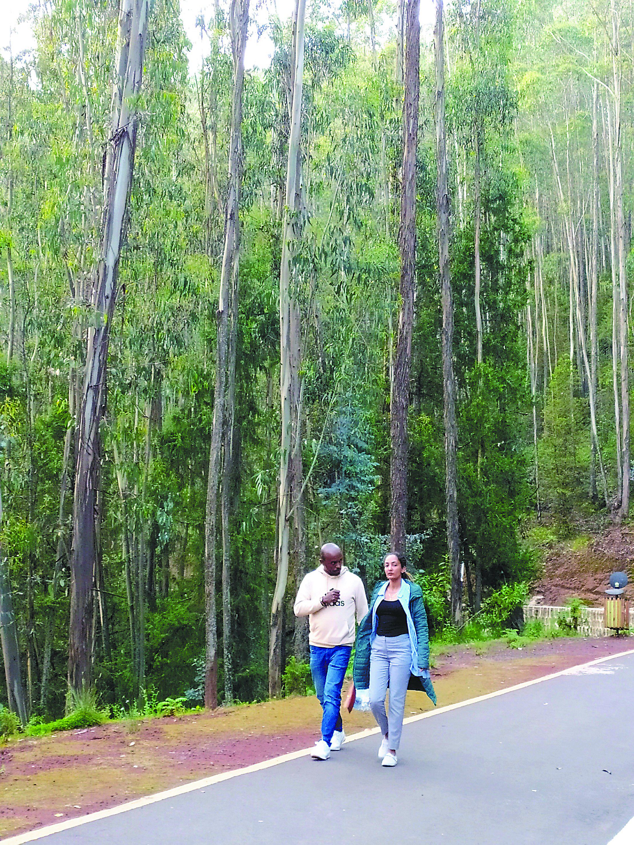 《環球時報》記者注意到,在亞的斯亞貝巴,桉樹最多、最集中、最壯觀的地方,莫過於城北的恩託託山了。記者前幾年去那裏採訪時,恩託託山幾乎是一片荒山,沒有公路到達。這次前往,記者發現山上新建了一個“恩託託公園”。遠遠望去,恩託託山的桉樹翠綠無邊,宛如桉樹森林的海洋。站在山巔向下俯瞰,目光所及,到處都是大片大片的桉樹,它們一棵棵你挨着我、我擠着你,密密麻麻,儼然綠色的天堂一般。原先,荒涼的山上沒有任何人工設施,現在建成公園後,山上有供人們歇腳的長椅長凳,有好幾個面向遊客的咖啡館,有可以鳥瞰山下和遠眺亞的斯亞貝巴城的觀景台,還有固定望遠鏡可以滿足感興趣者拉近景色的觀賞需求。幾名當地的年輕姑娘説笑着,一個個輪番湊在固定望遠鏡前,透過望遠鏡的小孔觀望遠處的桉樹,邊看邊發出陣陣爽朗的笑聲。
