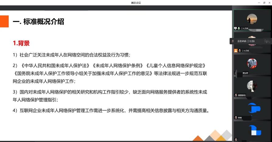 11月4日,由廣東省遊戲產業協會牽頭,三七互娛、騰訊、網易等互聯網企業及多家社會組織共同參與起草的《互聯網企業未成年人網絡保護管理體系》團體標準於線上召開討論會,三七互娛、網易、小米、雷霆、趣丸、米緣、金科、百田、中手遊、遊愛、愛加密等近30家企業代表參與了標準研討。