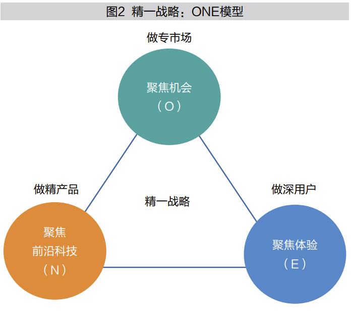基於對OPPO戰略模式的深入觀察與研究,我發現“精一戰略”包含三個維度:聚焦於機會(Opportunity),做專市場;聚焦於前沿科技(New-technology),做精產品;聚焦於體驗(Experience),做深用户。我將這一模型稱之為“精一戰略”ONE模型(見圖2)。