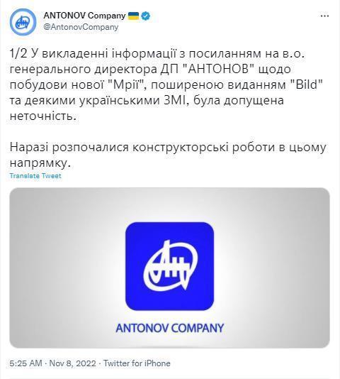 報道稱,此前一些烏克蘭媒體援引安東諾夫飛機制造廠總經理葉夫根尼·加夫裏洛夫(Yevgeny Gavrilov)的話稱,該公司已開始在烏克蘭建造新的安-225運輸機,目前建造已完成30%。針對這些報道,安東諾夫公司在社交媒體推特上發文進行澄清。相關推文寫道:“德國《圖片報》和一些烏克蘭媒體所發表的援引安東諾夫國有企業總經理有關建造新‘夢幻’運輸機言論的報道,並不準確。目前開始的是這一方向的設計工作。”