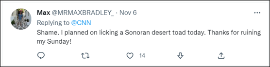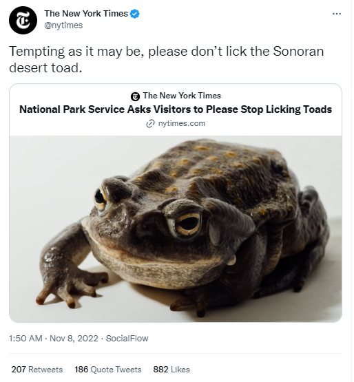 如上圖所示,CNN在官方推特賬號上警告民眾:儘管這種蟾蜍看着“很美味”,但請千萬不要去舔它。此外,美國《紐約時報》、國家公共廣播公司也發佈了同樣的消息,警告大家“千萬別用舌頭舔這種蟾蜍”。