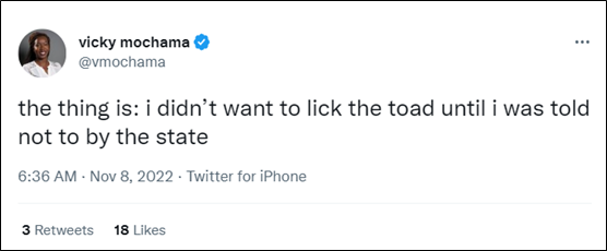 由於美國一直存在嚴重的毒品問題,隨着最近經濟形勢不樂觀後,一些為了省錢的“癮君子”試圖用“舔蟾蜍”來代替吸食毒品獲得“快感”,甚至發展成了一種新型的吸毒方式,被稱為“蟾蜍舔”(licking the toad)。