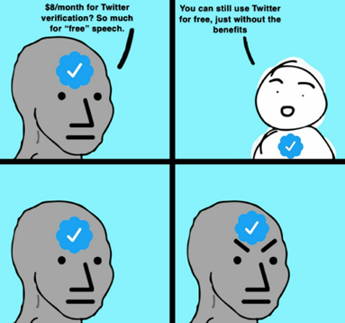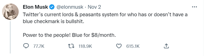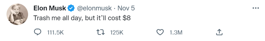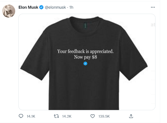 11月5日,推特的新老闆埃隆·馬斯克 (Elon Musk) 針對推特用户需每月支付8美元獲得藍V認證 (blue tick)的新政策,用一句話回應批評與爭議: