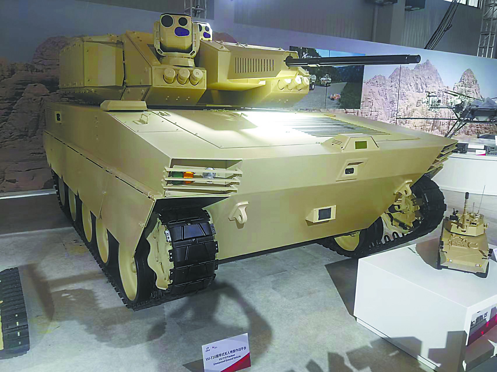 相比各種無人機和巡飛彈,珠海航展上的無人地面作戰車輛在作戰性能上也毫不遜色。除了VT-5U輕型坦克可以臨時客串“無人坦克”外,兵器工業集團的VU-T10履帶式無人地面作戰平台也堪稱重型無人車輛。VU-T10主要針對城市環境作戰,選擇採用厚重的履帶式底盤,配備有30毫米口徑遙控武器站,未來還可以根據需要配備4枚“紅箭-12”反坦克導彈,加載7.62毫米機槍,其武器配備的豐富程度相比俄羅斯BMPT“終結者”火力支援車也不遜色,卻沒有了後者在巷戰中可能遭遇人員傷亡的風險。