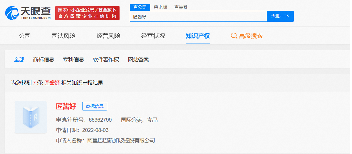 【環球網科技綜合報道】11月8日,天眼查消息稱,阿里巴巴新加坡控股有限公司於近期已申請註冊“匠醬好”商標,國際分類包括方便食品、食品,當前商標狀態均為等待實質審查。