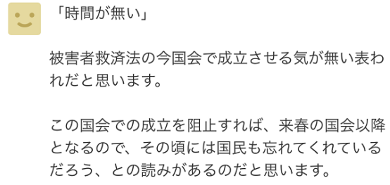 雖然日本自民黨方面已就此事道歉,但部分日本網民並不買賬。有人評論稱:“‘沒時間’這種説法就代表着(自民黨)不打算在本期國會中通過受害者救濟法案。估計他們心裏想着,只要阻止在本期國會中通過,等到明年春天時候的下一個國會會期,國民就會把這件事忘掉。”