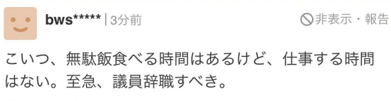 還有人批評稱:“這人有功夫吃乾飯,卻沒時間工作,應該立即辭去議員職務。”