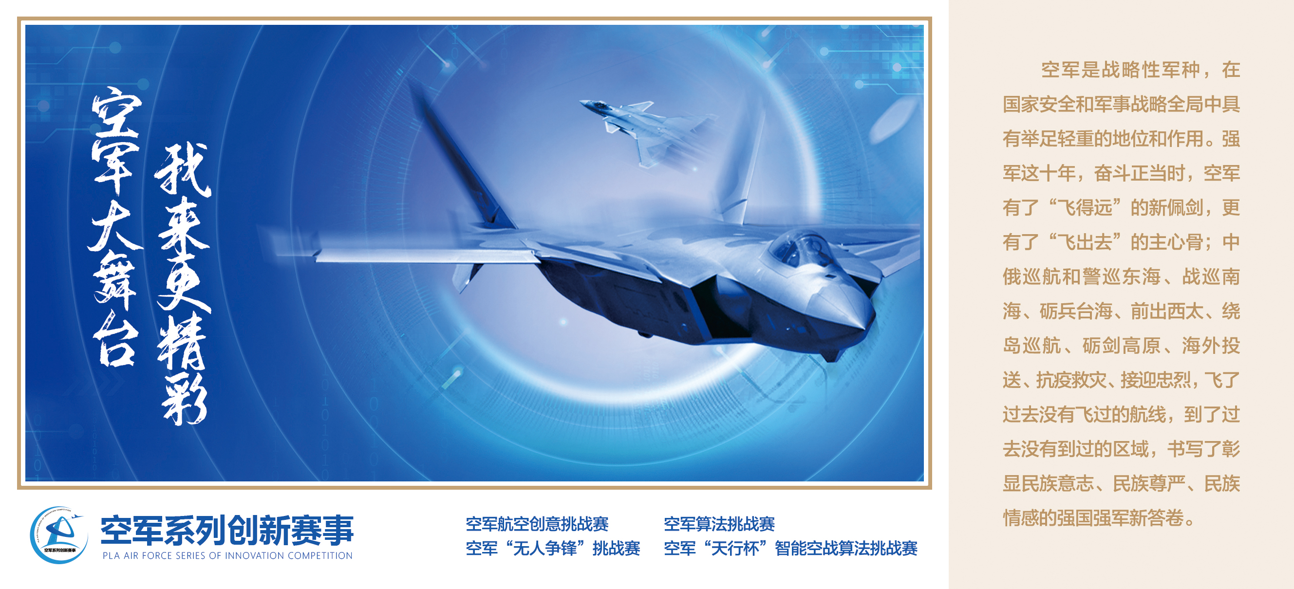 空軍副司令員賈志剛中將介紹,空軍系列創新賽事共包含航空創意挑戰賽、“無人爭鋒”挑戰賽、算法挑戰賽和“智能空戰”挑戰賽4項賽事,分別在2022年12月份和2023年2-3季度舉辦。