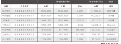 從躋身上市公司前十大流通股東的數量來看,華泰證券依然位居榜首。據同花順數據統計,截至三季度末,華泰證券現身153只股票的前十大流通股東行列,較上期減少61只。值得注意的是,華泰證券第一重倉股仍為江蘇銀行,本期持股數量並無變動,三季度末持股數量為8.32億股,期末持股市值61.90億元,較上期增長2.66億元。三季度中信證券持股最多的是中信建投,持有3.82億股,市值88.71億元,相較於二季度的市值110.68億元,三季度市值大幅下跌。同期中信證券增持了341.28萬股華夏幸福,持股市值為3.37億元,較二季度末降低0.84億元,中信證券減持上海萊士43.07萬股,持股市值6.70億元,較二季度末降低0.78億元。持有證券數量上,光大證券、中金公司、平安證券、中信證券、招商證券、華泰聯合6家券商有所增加。中金公司在上期持股30家的基礎上增持15家,現身45家上市公司的前十大流通股東。中金公司第三季度重倉買入泰瑞機器、銀邦股份、協創數據,持股市值分別為4115.65萬元、4481.39萬元、5925.45萬元。