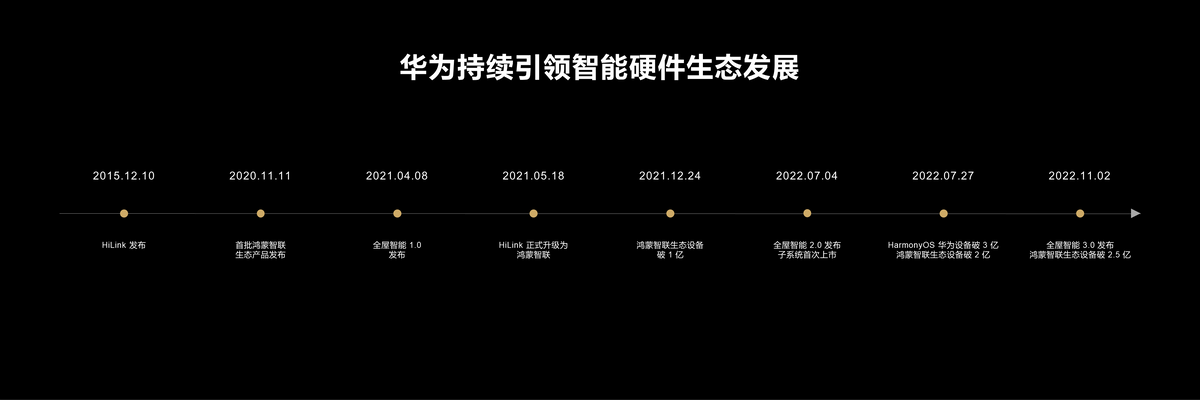 2022年3月,華為提出了全屋智能“1+2+N”解決方案;2022年7月,華為推出全屋智能2.0,帶來了全新的空間交互體驗及後裝解決方案,更多的子系統和更豐富的應用;11月2日,在華為PocketS及全場景新品發佈會上,華為全屋智能3.0正式亮相。圍繞“高可靠、高感官、高智能、高心意、高掌控”打造了五大核心優勢,給用户締造了更完整的空間智能體驗。