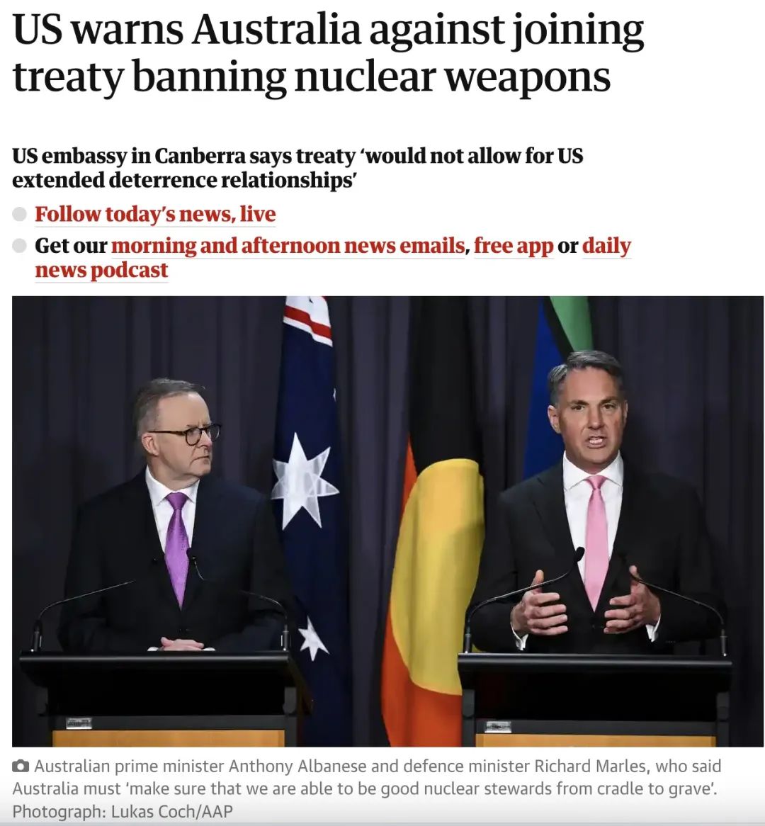 上月底,在聯合國的一次投票中,澳大利亞放棄了對《禁止核武器條約》的反對,轉而投了棄權票。這與澳大利亞政府此前多次與美國一致反對該條約的立場明顯不同。事實上,澳大利亞總理阿爾巴內塞近來也參與了反對核武器的宣傳,並將其描述為“有史以來最具破壞性、不人道和濫殺濫傷的武器”。