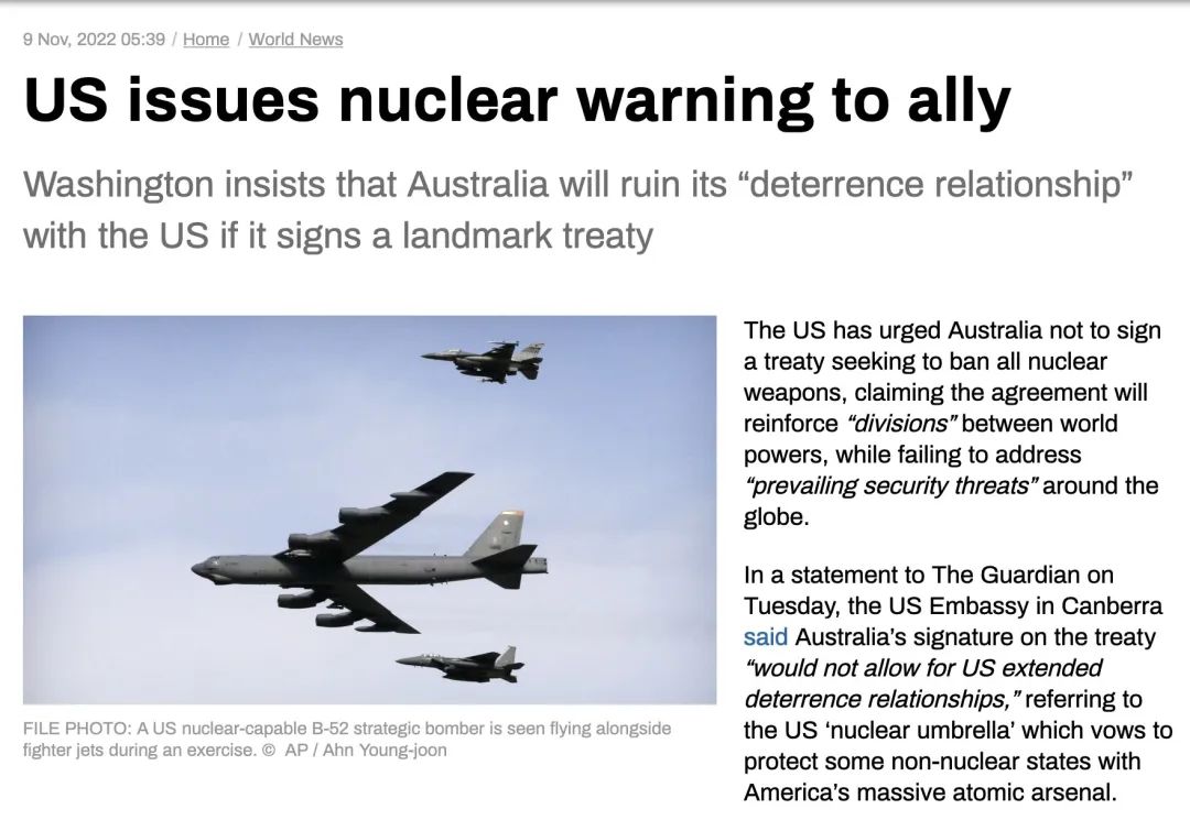 澳大利亞剛投了一次棄權票,“老大哥”美國的警告就來了。據今日俄羅斯電視台(RT)網站9日報道,美國敦促澳大利亞不要簽署一項禁止所有核武器的條約,聲稱該條約不僅無法解決全球範圍內“普遍存在的安全威脅”,而且將加強世界大國之間的“分歧”。