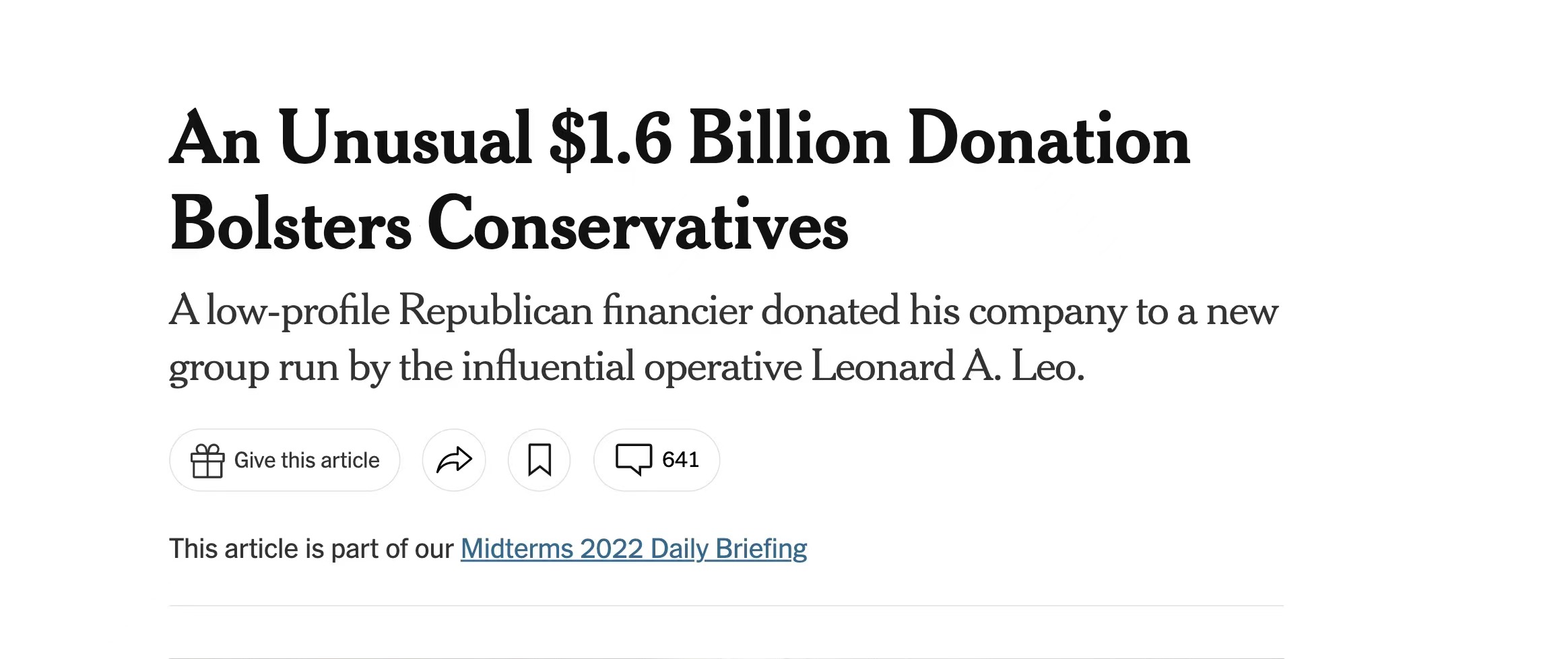 據《紐約時報》披露,一位不知名的電子製造業大亨巴里·賽德在過去兩年以股票捐贈的形式,向美國保守派政治活動人士萊昂納多·利奧領導的右翼團體“大理石自由信託基金”捐贈了16.5億美元。這是美國有史以來已知的最大一筆“黑金”,是“里程碑式”捐贈。