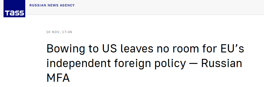 【環球網報道】自今年2月俄烏衝突爆發以來,以美國為首的西方國家實施了一系列對俄製裁。據塔斯社報道,俄羅斯外交部發言人扎哈羅娃11月10日在接受俄媒採訪時稱,歐盟國家“不斷屈從華盛頓”,“這將使他們沒有空間推進獨立的、確保其公民利益的外交政策”。