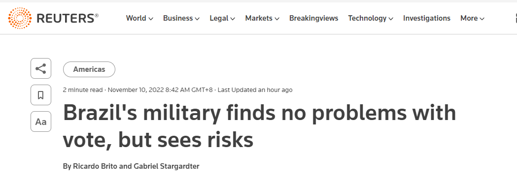 路透社稱,在巴西軍方最新提交的報告中,巴西國防部長保羅•諾蓋拉沒有提到在審計中發現投票系統存在任何具體問題。不過,報告表示投票系統的代碼中存在可能被利用的漏洞,這些風險有可能成為博索納羅支持者發起抗議活動的理由。與此同時,英國《衞報》10日的解讀是,“巴西軍方未發現選舉欺詐證據,博索納羅支持者希望破滅”,報道稱,這份長達63頁的報告未表明選舉存在欺詐,這“毀滅了極右翼取消盧拉勝選合法性的希望”。