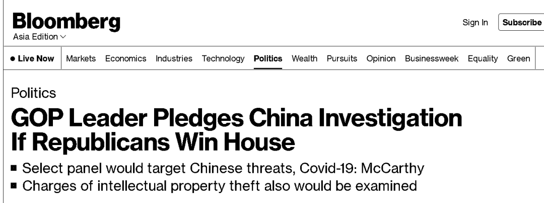 但這個麥卡錫也不是個善茬。在此次中期選舉前夕,他就曾多次表示如果共和黨贏得眾議院的控制權,他就將會在眾議院對中國發起一系列的“調查”,包括對新冠病毒源頭的“調查”和對“中國竊取美國知識產權”的調查。