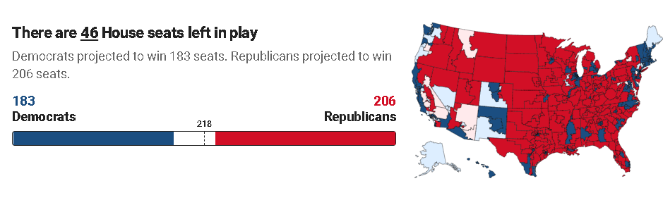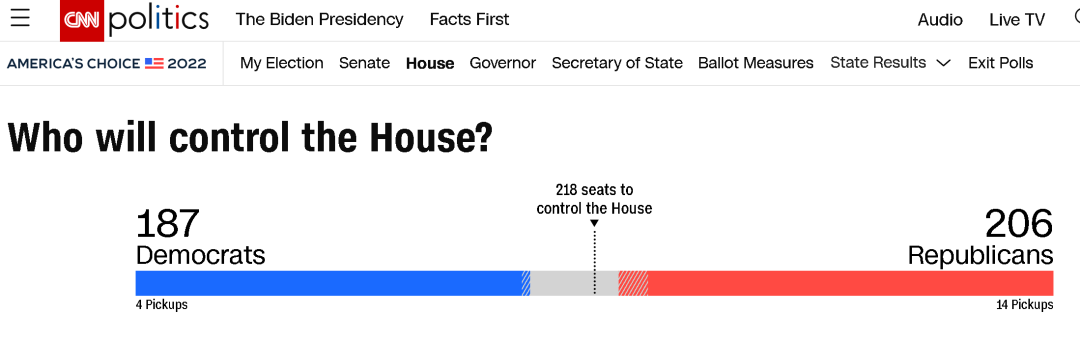 截至北京時間11月9日深夜,從多家美國媒體預測和計票趨勢來看,共和黨很可能會在擁有435個席位的美國國會眾議院獲得超過半數的218個席位,從而拿下眾議院的控制權——儘管計票還在繼續且共和黨在218席之外還能額外贏得的席位可能不會很多。