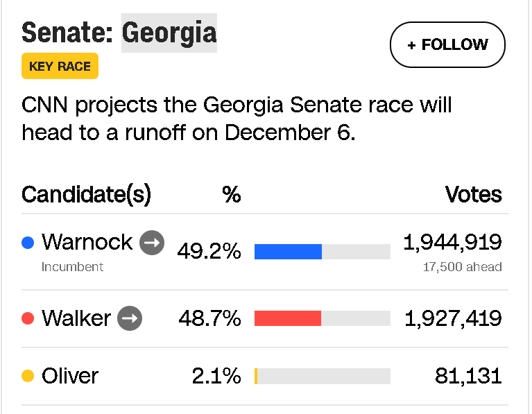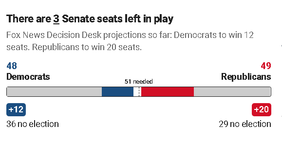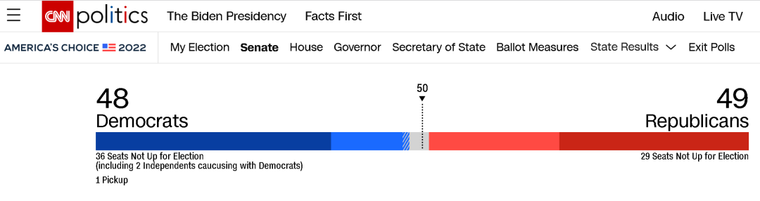 而在擁有100個席位的參議院的爭奪中,共和黨與民主黨目前則保持着“均勢”,最終結果的出台甚至可能還需要幾周,因為在最為關鍵的代表佐治亞州的參議員席位爭奪上,兩名候選人都沒有得到超過50%的多數票,所以得進行“加賽”,結果可能要12月初才出來。