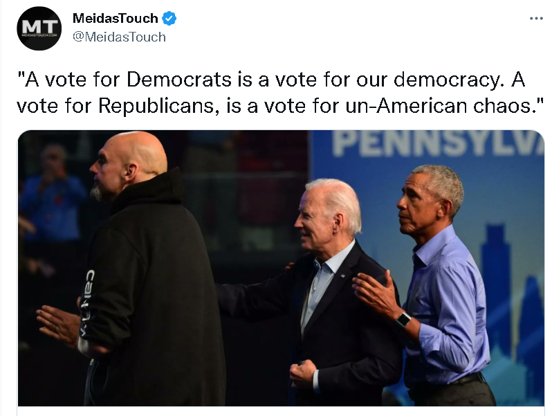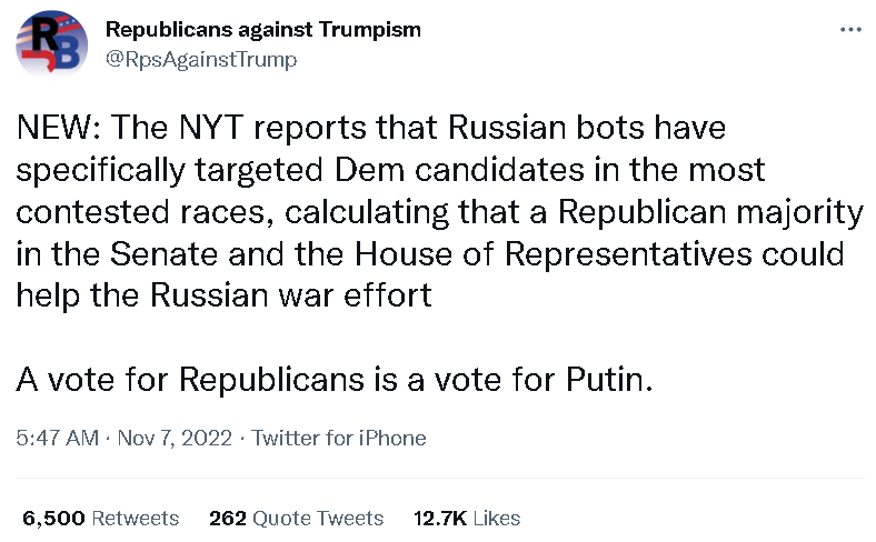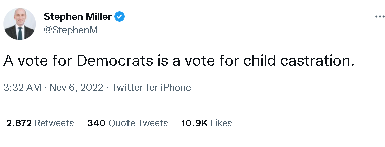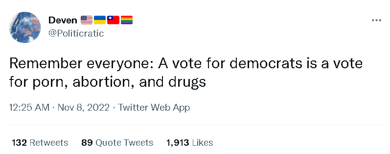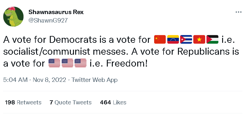 比如支持民主黨的人就宣稱給共和黨投票是在給“支持把女性貶為二等公民、要終結民主、大搞政治恐怖主義以及支持俄羅斯”的人投票;而共和黨的支持者則宣稱給民主黨投票是在給“支持暴力犯罪與毒品、兒童閹割、讓美國失敗以及共產主義”的人投票。