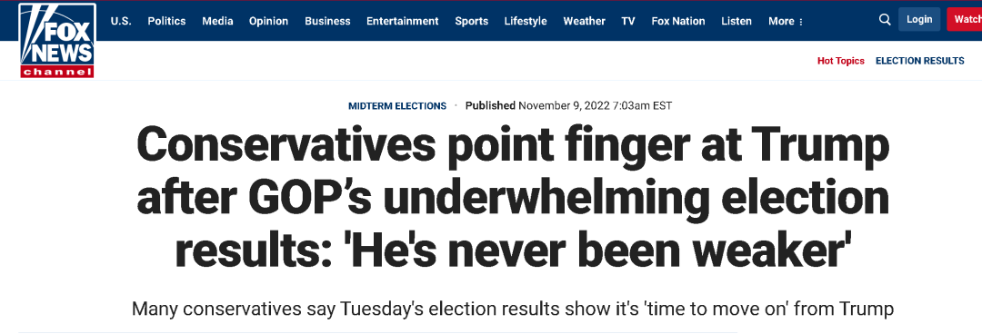 對此,親共和黨的美國福克斯新聞網就在一篇報道中稱,一些共和黨的分析人士認為此事與特朗普有關,都是特朗普欽點的那些候選人在一些重要的選舉中表現得不盡人意,有的還輸掉了本可以輕鬆贏得的選舉,才拉低了共和黨的選情。