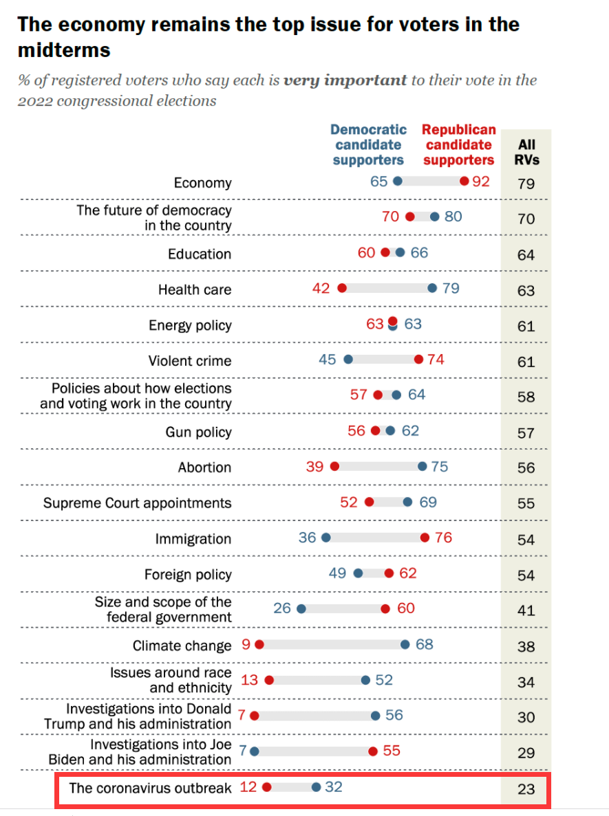 另外值得一提的是,共和黨即將在眾議院取得的勝利——雖然不算很大——還從一個側面反映出了美國人對待新冠疫情的態度變化。當他們在2020年面臨新冠疫情的衝擊,急需政府出面應對疫情、在經濟和醫療上加大公共開支給民眾“兜底”時,搞砸了疫情應對、又反對增加財政支出的共和黨就在選舉中遭遇了重創;但在今年,當美國人覺得疫情早已“過去”,現在需要有人來儘快解決通脹問題、壓低能源價格,又覺得民主黨在這方面難有建樹時,才在2年前疫情中搞死了那麼多美國人的共和黨,就又被美國人給選回來了。