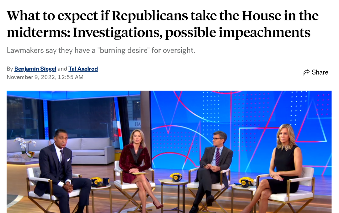 但對於美國總統拜登來説,共和黨若能拿下眾議院,對他來説就已經很糟心了。從多家美國和西方媒體在選舉前已經給出的分析來看,這是因為在接下來的2年裏,除了他的許多政策都將在共和黨掌控的眾議院遭遇重重阻擊,他本人也將面臨“磨刀霍霍”的共和黨議員在眾議院的瘋狂絞殺。