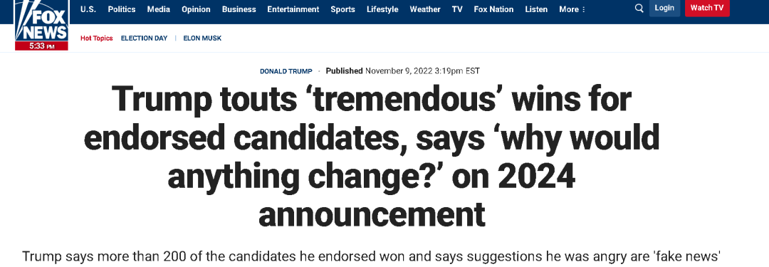 這種輿論,也給在中期選舉前宣佈自己在11月15日會有大消息宣佈的特朗普,足足潑了一盆冷水。此前輿論普遍認為,特朗普要宣佈的大消息,是他會繼續參加2024年的美國總統選舉。
