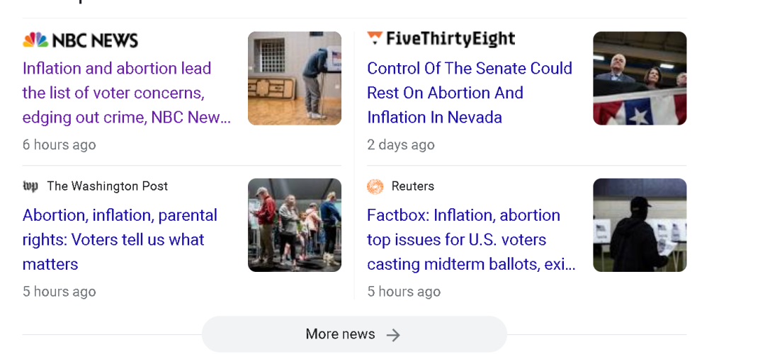 實際上,就在選舉前的一週,美國CNN的民調就顯示,雖然通脹和墮胎都是美國人最為關心的兩大議題,但關心通脹、將其視為能決定選舉的核心問題的受訪者,在全部受訪者中的比例多達51%,而將墮胎視為核心議題的則僅為15%——儘管也有一些其他民調顯示,在個別地區墮胎議題比通脹更受關注。