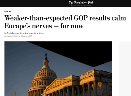 不過,從美國《華盛頓郵報》的最新報道來看,歐洲對於目前中期選舉的結果還是暫時稍微鬆了一口氣的,因為共和黨的勢頭沒有他們起初擔心的那麼猛。