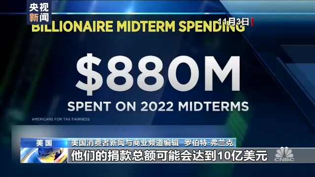 *美國消費者新聞與商業頻道編輯 羅伯特·弗蘭克:*億萬富翁們在中期選舉中的捐款總額達到了創紀錄的8.8億美元,比2018年增長了44%。到了週二(11月8日投票當天),他們的捐款總額可能會達到10億美元。這些富豪們給共和黨和民主黨都捐款,但是更偏向共和黨。資金比大約是3(共和黨):2(民主黨),政治行動委員會(PACs)每花10美元,其中就有1美元來自億萬富翁。