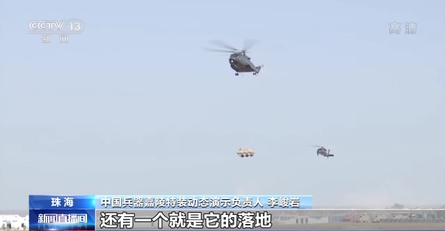 *中國兵器嘉陵特裝動態演示負責人 李峻巖:*這個難度還是很大的。首先是可以被直升機吊運,就要求它比較輕,然後尺寸也比較小,還有一個就是它的落地還是有一定的衝擊的,要能夠承受落地的衝擊。這個(表演)既是一個展示,又是貼近實戰化的一個訓練。