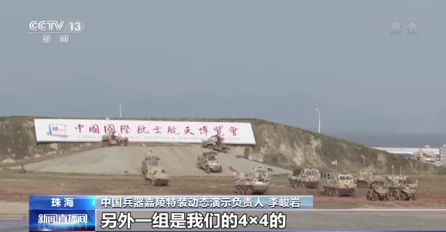 *中國兵器嘉陵特裝動態演示負責人 李峻巖:*我們6×6底盤的這裏面有火力、有偵察、有指揮,還有物資收集,這是一組。另外一組是我們的4×4的,它是一個可以無人跟隨的展示,還有一個就是我們8×8和小的ATV,他們編成了一組。我們用這三組在水坑、樓梯,包括起伏路(等)各種路面設施上進行一種動作的展示,既展示了山貓優越的這種通過性能,又呈現出一個好的畫面給觀眾。