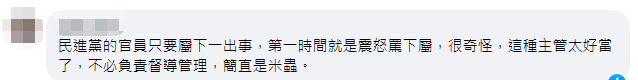 還有人表示,“民進黨的官員只要屬下一出事,第一時間就是震怒罵下屬,很奇怪,這種主管太好當了,不必負責督導管理,簡直是米蟲。” ↓