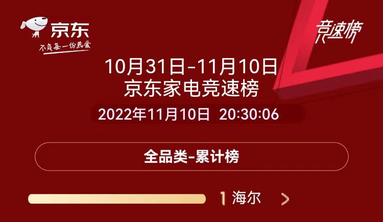 11月10日晚8點一到,雙11吹響了最後衝鋒的號角!據京東數據顯示,海爾智家火力全開,開搶18秒破億,3分鐘破3億,零售規模行業居首。此外,截至11月10日,海爾智家已經在京東家電競速榜全品類榜連續“置頂”11天,並獲得冰箱、洗衣機、熱水器等多品類第一。