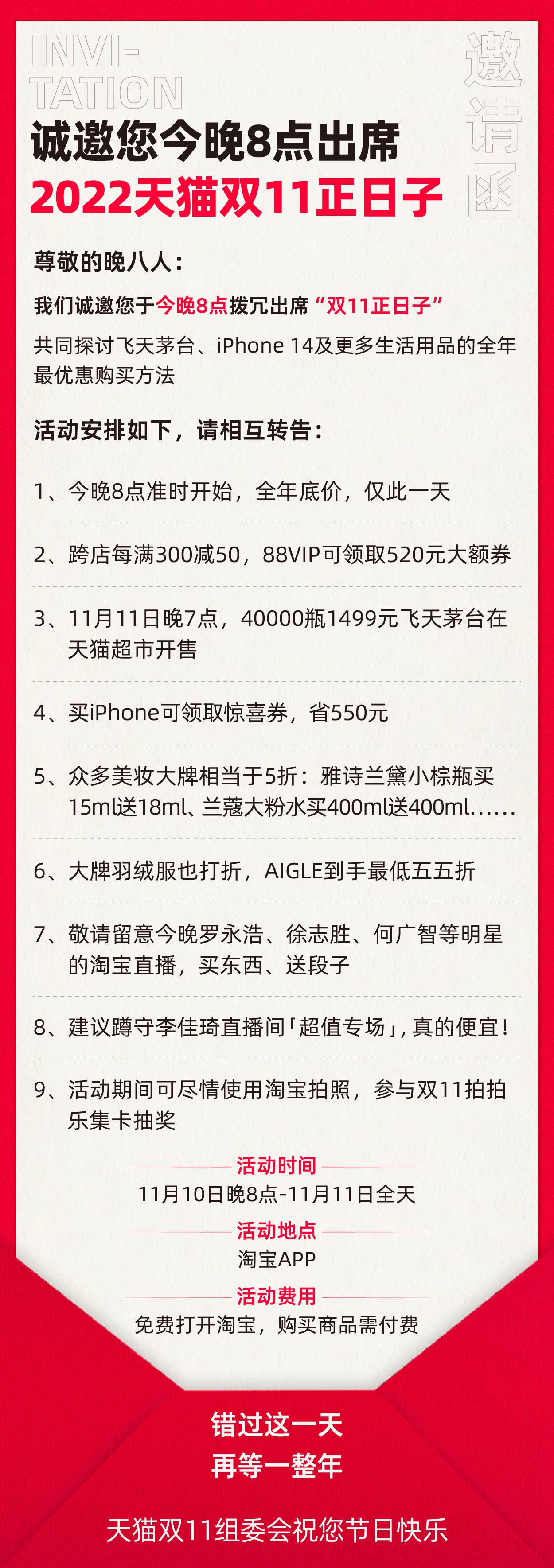 官方介紹,天貓雙11正日子當天,有超過400萬是與第一波完全不同、新加入雙11的實惠商品。其中1499元的飛天茅台放量40000瓶,11月11日晚7點在天貓超市開售。