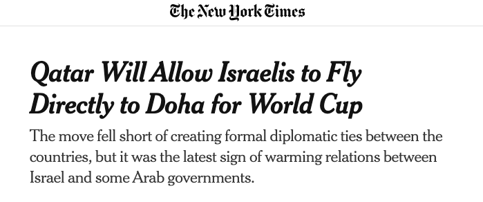 國際足聯表示,世界盃比賽期間,在多哈的以色列人可以通過由設在多哈的指定私營國際旅遊公司與以色列外交部協調提供的臨時領事服務得到相關協助。