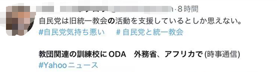 有人批評稱,“這隻會被看作自民黨在支援統一教的活動”,並附上了“自民黨噁心”等標籤。