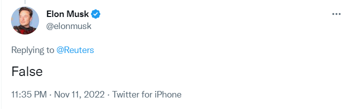 路透社當地時間11日在推特上發佈這篇報道後,馬斯克在評論區寫道:“假的。”不過他未詳細表述自己的看法。報道稱,該媒體聯繫到特斯拉總部的工作人員,後者也未對馬斯克的上述回應進行評論或解釋。因此,路透社表示,無法確定馬斯克的這番否認是否會對上述計劃產生影響。