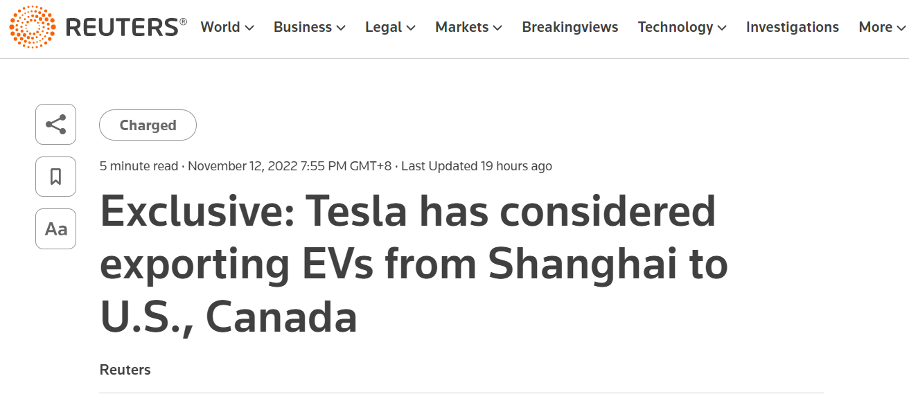【環球網報道】路透社12日報道稱,兩名知情人士告訴該媒體,美國電動汽車生產商特斯拉公司考慮將其上海超級工廠生產的電動汽車銷往美國和加拿大。報道稱,該計劃會將特斯拉的最大工廠與最大市場——北美市場連接起來。對此,特斯拉公司首席執行官馬斯克隨後在路透社這篇報道推文的評論區回覆:“假的(False)。”