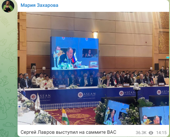 據俄新社報道,扎哈羅娃13日在社交平台Telegram上發了一張拉夫羅夫在東亞峯會上發言的圖。俄新社注意到,從這張圖可以看到,拉夫羅夫發言時,包括拜登在內的美方代表團成員在場。