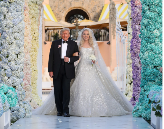 據美國《紐約時報》報道,婚禮上,29歲的蒂芙尼在父親特朗普陪同下,穿着定製婚紗,在250位賓客面前走過紅毯。在家人的見證下,特朗普將女兒交給帥氣多金的新郎布洛斯。特朗普嫁女兒不可能不吸引媒體的關注,連那枚價值 120 萬美元訂婚的鑽戒都成了輿論的談資。