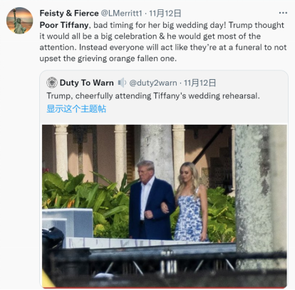 另一位網友轉發這一貼文併發推稱,“可憐的蒂芙尼,她婚禮的時間真不湊巧!特朗普本認為這將是一場盛大的慶祝,他會得到大部分關注。相反,每個人都會表現得像在參加葬禮一樣,以免讓悲傷的橙子傷心。”(編者注:特朗普臉上發橙色的皮膚曾是美媒和輿論關注的話題)↓