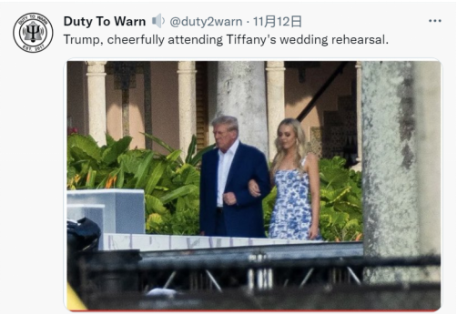 一位網友發推稱,“特朗普興高采烈地參加蒂芙尼的婚禮彩排。”然後配圖中,特朗普的表情並沒有“興高采烈”。↓